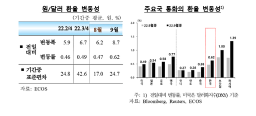 23일 한국은행에 따르면 9월 원·달러 환율 변동폭은 지난 8월 6.2원에서 8.7원까지 뛰었다. 같은 기간 변동률도 0.47%에서 0.62%까지 올랐다.