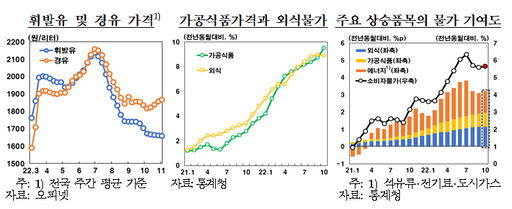 실제로 통계청이 발표한 '10월 소비자물가 동향'에 따르면 지난달 소비자물가지수는 109.21(2020=100)로 1년 전보다 5.7% 오르며 석 달 연속 5%대 상승세다. 물가 상승률이 두 달 연속 둔화세를 보여왔지만 석 달 만에 다시 확대된 것이다. 석유류 오름폭 축소 흐름이 이어졌으나 가공식품 오름세 확대, 전기·도시가스 인상 등으로 5%를 상당폭 웃도는 수준을 이어갔다.