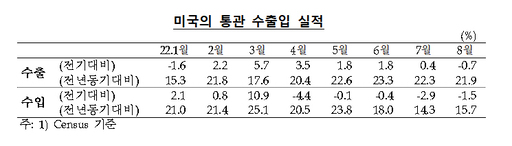 올 4월 이후 원유·천연가스 등 에너지 수출 증가, 재화소비 부진에 따른 소비재 수입 감소 등으로 미국의 무역수지 적자규모는 점차 축소되고 있다. 수출은 올해 중 대체로 전년 동기 대비 20% 내외 수준의 높은 증가세를 이어가고 있는 반면, 수입은 4월 이후 증가세가 둔화됐다.